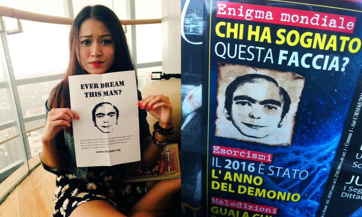 The portrait which allegedly launched a thousand nightmares — accompanied by the words “EVER DREAM THIS MAN?” — has reportedly appeared on flyers in dozens of major cities around the globe, with photographic evidence to confirm their placement (if not their source). This was followed by a persistent meme featuring the same moon-shaped, faintly grinning face — which appears to be that of a middle-aged adult male with large dark eyes, thick black eyebrows meeting in the middle, and thinning hair on top.