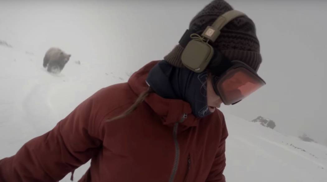 As she notes after watching the video later, Murphy claims the music made it impossible for her to hear the grunts of a rapidly-approaching brown bear — which can be seen running at top speed several yards behind her, detected by the back-facing camera — but unseen by the snowboarder herself.