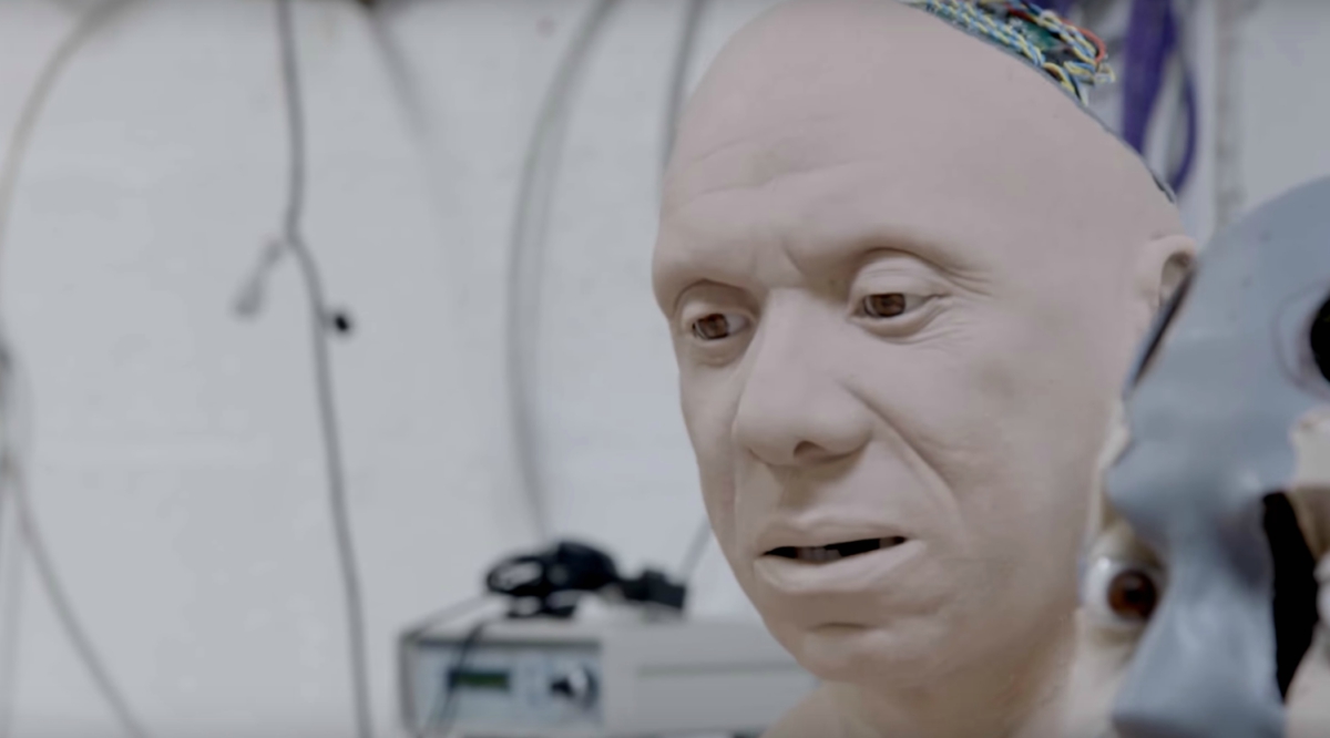 However, as the clip shows, Fred’s fragile mask of humanity begins slipping (intentionally, on the part of his designers): he occasionally stutters, makes short-circuiting sounds while blinking his eyes separately, and calmly asks “Do you want to meet your maker?” before violently smashing his beer glass on the table.
